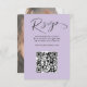 Esta moderna placa RSVP reúne elegância e conveniência com tipografia limpa e contemporânea sobre fundo roxo macio. Uma seção de código de QR dedicada permite que os convidados acessem rapidamente o site do casamento ou as informações de RSVP, simplificando o processo de resposta. O verso oferece um toque pessoal com espaço para sua foto e monograma, adicionando um detalhe único e memorável. Totalmente personalizável, este design elegante combina minimalismo com sofisticação, garantindo que complementa qualquer estilo de casamento e ajudando você a reunir respostas com facilidade e estilo.