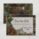 Um convite de casamento com tema rústico florestal, cartão de aviso de data para o homem da montanha e fada da floresta encantada. Este design apresenta um fundo com design de tábua de madeira escura rústica e adornado com galhos de sempre-verde em cedro, abeto e pinhas elegantes. Personalize adicionando o nome da noiva e do noivo, bem como a data do casamento.