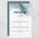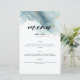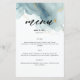 Um modelo de cardápio de praia que apresenta uma pintura, abstrato, de aquarela de uma praia e ondas com efeito de derrame de tinta dourada (o ouro é um efeito digital, não uma folha real!) e uma caligrafia moderna. Clássico e elegante, simples e moderno, é uma escolha adorável para um casamento de praia em qualquer estação, para um casal moderno.