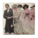 Ilustração vintage amor e romance Imagem da cerimônia de casamento vitoriana com a noiva e o noivo se casando. Os recém-casados estão ajoelhados em uma almofada e as damas de honra estão usando chapéus elegantes e sofisticados com penas e segurando buquês de flores. Artista: Harrison Fisher, intitulado O Casamento.