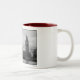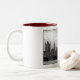 Esta caneca de café branco com interior vermelho caracteriza uma foto preto e branco das casas do parlamento em Londres com os dois ônibus de dois andares vermelhos.