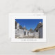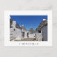 Cartão postal com casas tradicionais de gesso branco, com azulejos de pedra em telhados cônicos, em uma pequena rua na cidade de Alberobello, Vale de Itria, na Apúlia, Itália, com uma fronteira branca e o texto: "Alberobello".