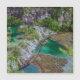 Vislumbre de cima da cascata das cascatas e do caminho de madeira com turistas no Parque Nacional de Plitvice, na Croácia. Paisagem de cascata de floresta nas montanhas.