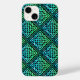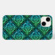 Um iPhone 14 Case com um nó celta azul-esverdeado repetiu o padrão de azulejo contra um fundo preto. Não é um iPhone 14? Sem preocupações, também está disponível para outros tipos de dispositivos =)