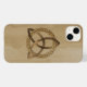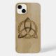 Um Caso do iPhone 14 Plus com um triquetra Celta de cor simples entrelaçada com um círculo formando um símbolo trinitário contra um fundo de madeira, representando a unidade espiritual com o divino.