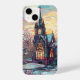 Um encantador caso iPhone 14, ajustado fino, com uma imagem de uma igreja de inverno em estilos de vidro manchado.