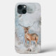 iPhone 13 Case com uma imagem pintada de um veado no inverno e um planeta acima. Há espaço para um nome se você quiser adicionar um. Obrigados para a Creative Fabrica para alguns dos elementos na design.