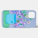 Caso do iPhone 13 com um pote de flor azul desenhado à mão, com folhas rosa e púrpura, e flores coloridas mistas. O fundo é azul e o cobrir da mesa é verde. Você pode adicionar seu nome ao pote ou ao canto superior direito.