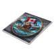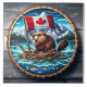 Um castor canadense vivo veleja numa balsa entre peixes, com a bandeira e as montanhas canadenses no pano de fundo, mostrando a beleza e a vida selvagem da natureza.