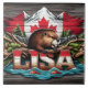 Um castor canadense senta-se num galho perto da água, cercado por árvores, montanhas e um pano de fundo de folhas de mapa, mostrando a beleza natural do Canadá.