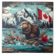Um castor canadense encontra-se num lago de sereno, rodeado por montanhas e folhas de outono, incorporando a essência da paisagem natural.