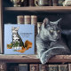 Um gato de mesa prateado derrubou e quebrou duas plantas em planadores terra cotta em pano de fundo azul