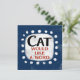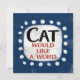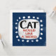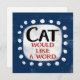 Um design de animais tipográficos irreverente e fofo que diz "Cat Gostaria de Uma Palavra". Ele apresenta texto preto e vermelho em um retângulo branco com pontos brancos engraçados e lúcidos ao seu redor, tudo em um fundo azul.