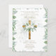 Elegante cristão, convite de casamento de fé católica com campos de texto modelo para ambos os lados para que você inclua cerimônia de casamento, recepção, rsvp, ordem resumida do programa do dia. Rosas brancas, folhas verdes, convite decorado com cruz de ouro.