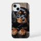 A imagem mostra o filhote Cavalier King Charles Spaniel com pele preta e bronzeada. Cavie está sentado em fila, olhando diretamente para o espectador. O filhote tem olhos grandes e expressivos e ouvidos lisos. O fundo é um castanho macio e turvo, criando uma atmosfera quente e convidativa. O estilo de pintura é realista, captando os detalhes do pelo e das características dos cachorros.