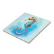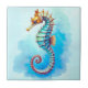 Azulejo cerâmico em design de aquarela, de um cavalo de mar, colorido e com tons de bronzeado, turquesa e aqua. A cauda enrolada e textura espessa lhe dão personalidade, e o fundo macio turquesa adiciona um sonho subaquático.