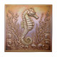 Uma encantadora adição à sua decoração, este azulejo apresenta um majestoso cavalo-marinho graciosamente posicionado em meio a algas marinhas detalhadas e ondas estilizadas. A textura de falso baixo-relevo enfatiza o corpo estriado e a cauda enrolada do cavalo-marinho, enquanto o acabamento em cobre rico e quente proporciona uma profundidade metálica sofisticada. Este azulejo é perfeito para adicionar um toque de textura artística de alta qualidade a espaços industriais, rústicos ou náuticos refinados, servindo como uma peça característica excepcional. Procure por ID1223 para ver outros elementos marinhos nesta série metálica dramática. Nota: o design pode conter conteúdo gerativo.