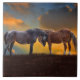 Belos cavalos no pôr do sol. Esta é uma imagem de fantasia surreal. Um cavalo azul e palomino livre no campo com um céu incrível.