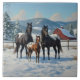 Uma bela família negra de cavalos appaloosa na neve numa pastagem numa fazenda. Uma paisagem de inverno cênica atrás deles inclui um celeiro vermelho, árvores e colinas.