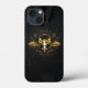 Composição de preto e ouro desenhada artificialmente, simétrica, asas de pássaros, ouro, crânio de pássaros decorado com padrão dourado sobre fundo escuro e texturizado.Estilo gótico