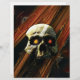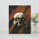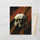 Caveira mau com tomadas oculares brilhantes e um fundo escuro com padrões de fundo com listras de laranja, marrom e preto. Feliz Dia das Bruxas, mortais.