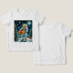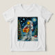 Esta vibrante design apresenta um astronauta num traje espacial de cheio segurando uma caixa de presentes de ouro, colocada contra um pano de fundo caprichoso de um céu noturno estrelado e uma árvore de Natal festiva. O contraste entre a vastidão do espaço e o calor das tradições de feriados torna esta imagem cativante e animadora.