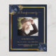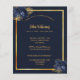 Um fundo azul marinho, uma falso estrutura dourada. Decorado com flores azuis. Personalize e adicione nome, datas e texto. Adicione uma foto atrás.