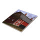 Você amará este azulejo que caracteriza a arte lindo de um celeiro vermelho do país com guarnição branca e as portas dobro moldadas por árvores bonitas. Estilo da pintura a óleo da fotografia original do artista. Grama verde, celeiro vermelho, céu azul nesta imagem idílico.