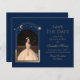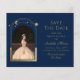 Azul Celestial Salva a Data Aniversário Quinceanera Invitation apresenta um sol dourado, lua e estrelas num fundo azul. Dentro é sua foto favorita e sua Quinceanera personalizada salva as informações de data. Personalize editando o texto nas caixas de texto e adicionando sua foto favorita. Projetado por ©2024 Evco Studio www.zazzle.com/store/evcostudio