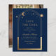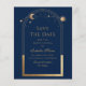 Azul Celestial Salva a Data Aniversário Quinceanera Invitation apresenta um sol dourado, lua e estrelas num fundo azul. Dentro é a sua Quinceanera personalizada para guardar as informações da data e, no verso, adicionar a sua foto favorita. Personalize editando o texto nas caixas de texto. Projetado por ©2024 Evco Studio www.zazzle.com/store/evcostudio