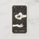 Este cartão de visita apresenta um design de estilo de placa de tarot em uma paleta de cores preta e creme. A ilustração mostra uma mão segurando um olho místico em um coração cercado por estrelas cintilantes. Isso seria perfeito para qualquer especialista em beleza, salão ou barra que prefere um cartão de visita no estilo do alternativo e queira tornar seu cartão de visita memorável.