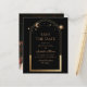 Célestial Black Save The Date Birthday Quinceanera Invitation apresenta um sol dourado, lua e estrelas num fundo preto. Dentro é a sua Quinceanera personalizada para guardar as informações da data e, no verso, adicionar a sua foto favorita. Personalize editando o texto nas caixas de texto. Projetado por ©2024 Evco Studio www.zazzle.com/store/evcostudio