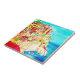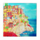 Azulejo contemporâneo Cena da Costa Italiana em azuis predominantes com salpicos de outras cores pastéis. Cena colorida mostrando uma falésia íngreme com casas multicoloridas apinhadas empilhadas para cima. Escadas na lateral da falésia sobem íngremes para cima. Mostra águas azuis frescas e azul mais claro para o céu. Um barco permanece na água junto à falésia. Pitoresco e encantador feito pelo artista em mídia mista.