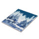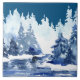 Azulejo cerâmico da cena de inverno. Imagem de árvores cobertas de neve ao lado de um rio à noite.