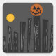 Jack o' lanterna em uma cerca com corvo em uma cena de Halloween em autocolantes quadrados. Divertido para uma festa ou celebração assustadora.