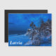 Cena de inverno noturna com neve coberta de pinheiros em uma lua à noite estrelada. Vista panorâmica de floresta de coníferas com caminho de madeira perto da costa marítima contra belos céus noturnos com estrelas