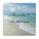 Bonito e elegante cena de praia oceânica com areia branca, água azul clara e um céu azul brilhante com nuvens brancas indefinidas. Pegadas ao longo da praia. Personalize-o com seus detalhes de casamento ou lua de mel, ou com nomes personalizados para qualquer ocasião.