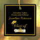 Ornamento de graduação com texto frontal e traseiro personalizado. Design de unísex legal fácil de personalizar com seu próprio texto. Apresenta a imagem de um boné de formando dourado e um diploma associado correspondente num quadrado enquadrado. Cores vermelhas, pretas e outros bonés também estão disponíveis neste mesmo design.