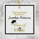 Ornamento de graduação com texto frontal e traseiro personalizado. Design de unísex legal fácil de personalizar com seu próprio texto. Apresenta a imagem de um boné de formando preto e diploma associado correspondente em um quadrado enquadrado. Cores azuis, vermelhas e outros bonés também estão disponíveis neste mesmo design.