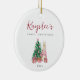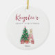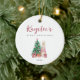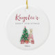 O primeiro ornamento cerâmico redondo de Natal do Bunny Rabbit Baby — O modelo de ornamento de Natal personalizado do precioso apresenta um adorável coelho aquoso, ao lado de uma árvore de natal festiva com presentes deliciosos. As caixas de texto permitem uma fácil personalização do nome de qualquer bebê em um tipo de letra de escrita caligráfica manuscrita, e o ano de nascimento em um serif simples e minimalista. Ambos os lados desta decoração personalizável, neutra em relação ao gênero da árvore de manutenção são idênticos.