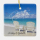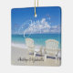 Uma cena da praia com as duas cadeiras de Adirondack na areia com as ondas de oceano que deixam de funcionar acima. O "Feliz Natal" está em um roteiro extravagante. Personalize adicionando seus nomes.