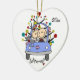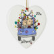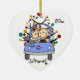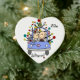 Um enfeite cerâmico bonito em forma de coração apresenta uma figura de palito marido e mulher no carro de casamento com seu gato no capô tendo seu primeiro Natal juntos como um casal casado! Mude facilmente a data para o ano atual neste casal bonitinho com o ornamento de design de árvore de Natal. Faz uma ideia de presente de excelente!