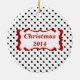 Um casal esperto, um super-herói infantil, e gato diante da árvore de férias decorada com uma área que diz "Estamos esperando!". O ornamento atrás é branco com bolinhas pretas, uma faixa branca de borda vermelha e texto vermelho que lê Natal 2014.