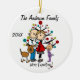 Um ornamento cerâmico redondo bonito do feriado do Natal da lembrança caracteriza uma figura casal da vara que espera um bebê e uma menina pequena da criança que está na frente de uma árvore de Natal decorada, do cão da família, e do texto que nos lê "está esperando!". Você pode personalizar esta figura bonito ornamento da vara adicionando seus nome e ano em curso de família!