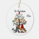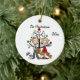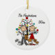 Um bonito ornamento de guarnição cerâmica redonda apresenta um casal de figuras de palitos, todos vestidos, ele com camisa e gravata, ela com um vestido vermelho, com dois cachorros marrons e um gato cinza, parado em frente à árvore de Natal. Adicione facilmente seus nomes e o ano atual para personalizá-los!