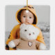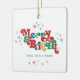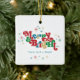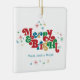 Estes ornamentos cerâmicos quadrados de 2,75" x 2,75" apresentam uma saudação retrorreflectora brilhante e colorida, "Feliz & Brilho", em vermelho, verde, azul e ouro, com marcadores para o(s) seu(s) nome(s) familiar(ais) e ano. Adicione sua foto favorita no fundo!