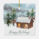 Este design apresenta uma ilustração da floresta de inverno - pinheiros, cervos e cabanas de madeira, cobertos de neve