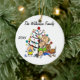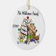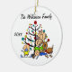 Uma cerâmica redonda bonito guardando o enfeite de Natal apresenta uma família de figuras de palitos incluindo uma mãe, uma menina, um menino de criança, e um menino dormindo, assim como o cachorro da família em frente a uma árvore de Natal decorada com áreas que você pode personalizar com seu nome de família e o ano atual! Este adorável enfeite de férias faz um presente de excelente para a jovem família comemorar um ano especial!