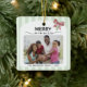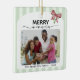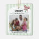 Este ornamento da árvore de Natal apresenta espaço para duas fotos enquadradas dentro de uma borda verde-clara e macia na frente e um vermelho rico no verso. No topo, a frase "memórias de FELIZ" é exibida com destaque, misturando uma fonte ousada e festiva com um roteiro elegante. Um arco de fita vermelho e verde adiciona um toque alegre de feriado no canto superior direito. A design transmite lindamente calor, conexão e celebração, fazer-a um belo presente de feriado.