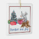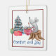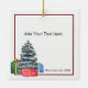 Este ratinho branco está relaxando com uma xícara de chá e aproveitando sua árvore de Natal. O texto na frente diz "Conforto e Alegria". O texto no verso pode ser personalizado.